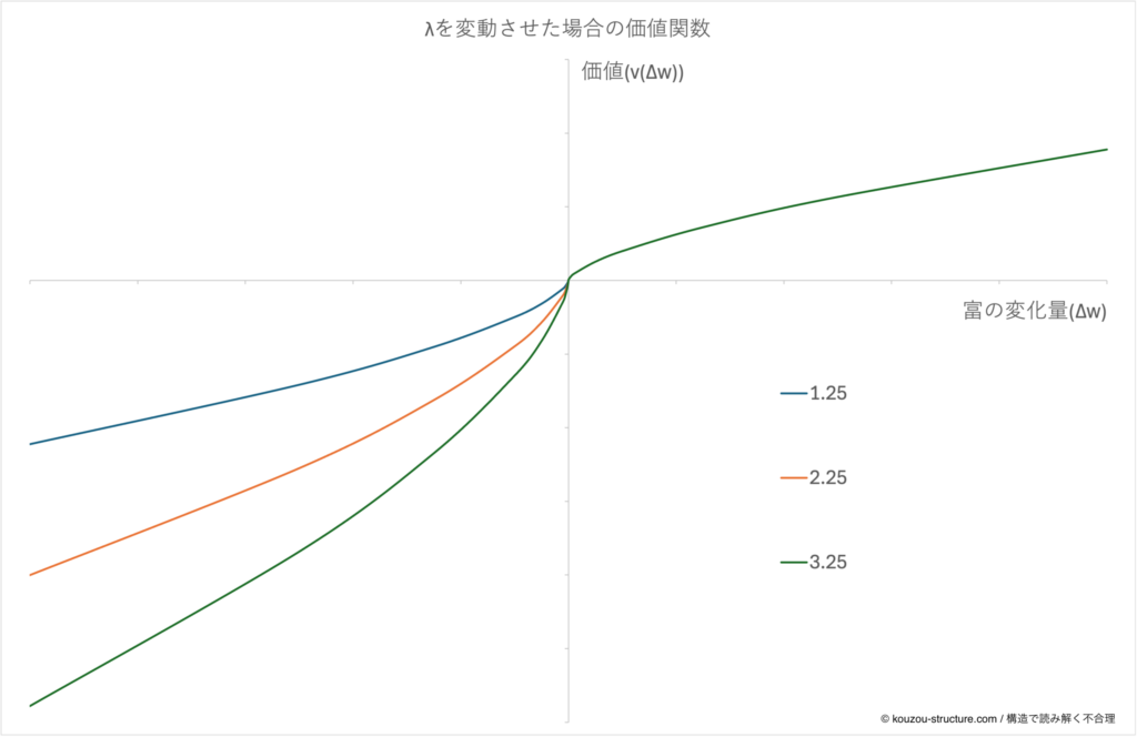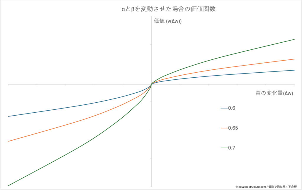 | α(アルファ) | 利得側の曲率(右側の凹み具合) | 得の頭打ち。ちょい得は効くが、だんだんテンション鈍る(利得側リスク回避) |
