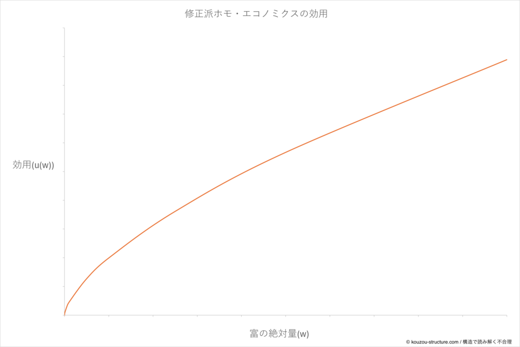 | 修正派ホモエコ | 最終的な富 w | 凹曲線:u(w)=w^α | p をそのまま | 利得側のリスク回避 |