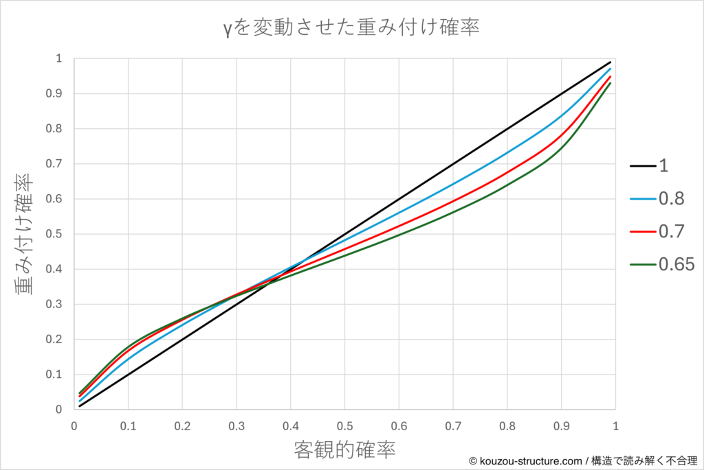 - π(p) : weighted probability(確率の“効き目”) 人間が体感している方の確率。